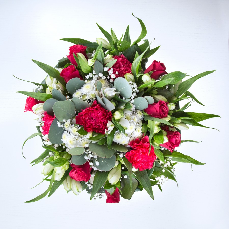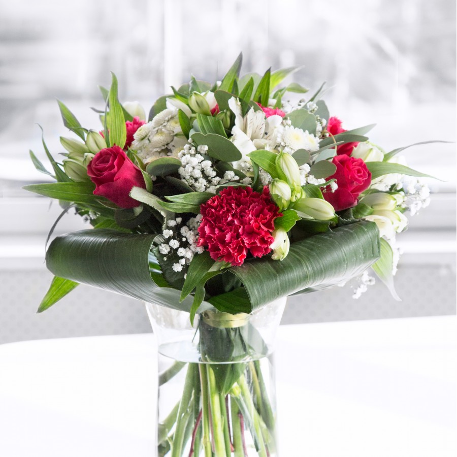Our bouquet is a beautiful collection of red roses intertwined with sweet white chrysanthemums and delicate gypsophila. Enhanced by white alstroemeria and aspidistra leaves, it offers a unique and elegant design that captivates the eye.